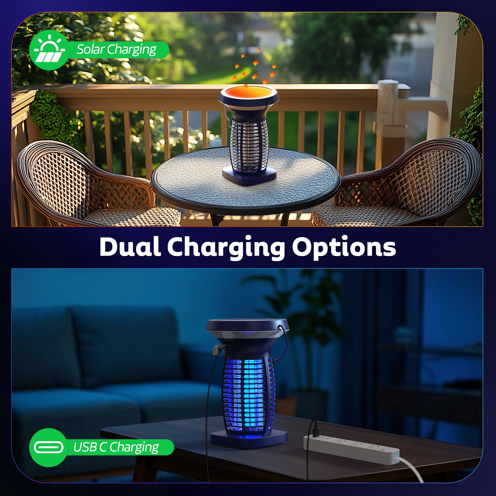 - Dual Charging Options: Solar & USB: This solar powered mosquito zapper comes with a monocrystalline solar panel and a built-in large rechargeable battery that charges via direct sunlight for eco-friendly, energy-efficient use. Alternatively, you can charge it quickly via USB using the included 4ft USB C charging cable in just 3-4 hours, this portable bug zapper indoor cordless offers convenience for both indoor and outdoor use, whether you're at home, camping, or relaxing in your backyard