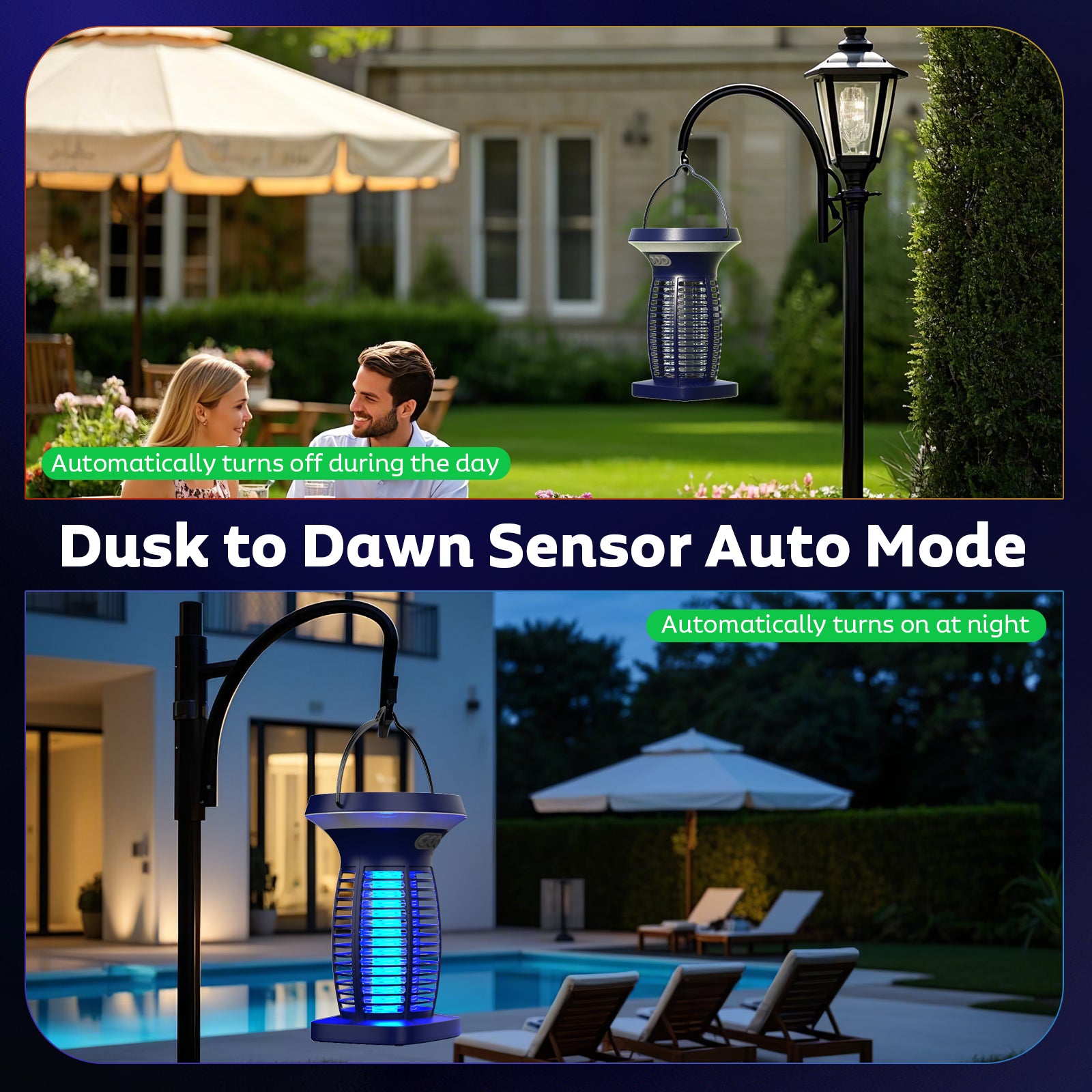 - 3-in-1 Bug Zapper with LED Lights & Auto/SOS Modes: This versatile device serves as a fly zapper, LED light, and emergency SOS tool. Use the mosquito lamp as a dimmable nightlight, camping lantern, or yard solar lights outdoor. It features an intelligent dusk to dawn sensor that automatically activates the fly killer based on surrounding light conditions. In emergencies, switch to SOS mode for a flashing light signal, ensuring safety during power outages or outdoor adventures